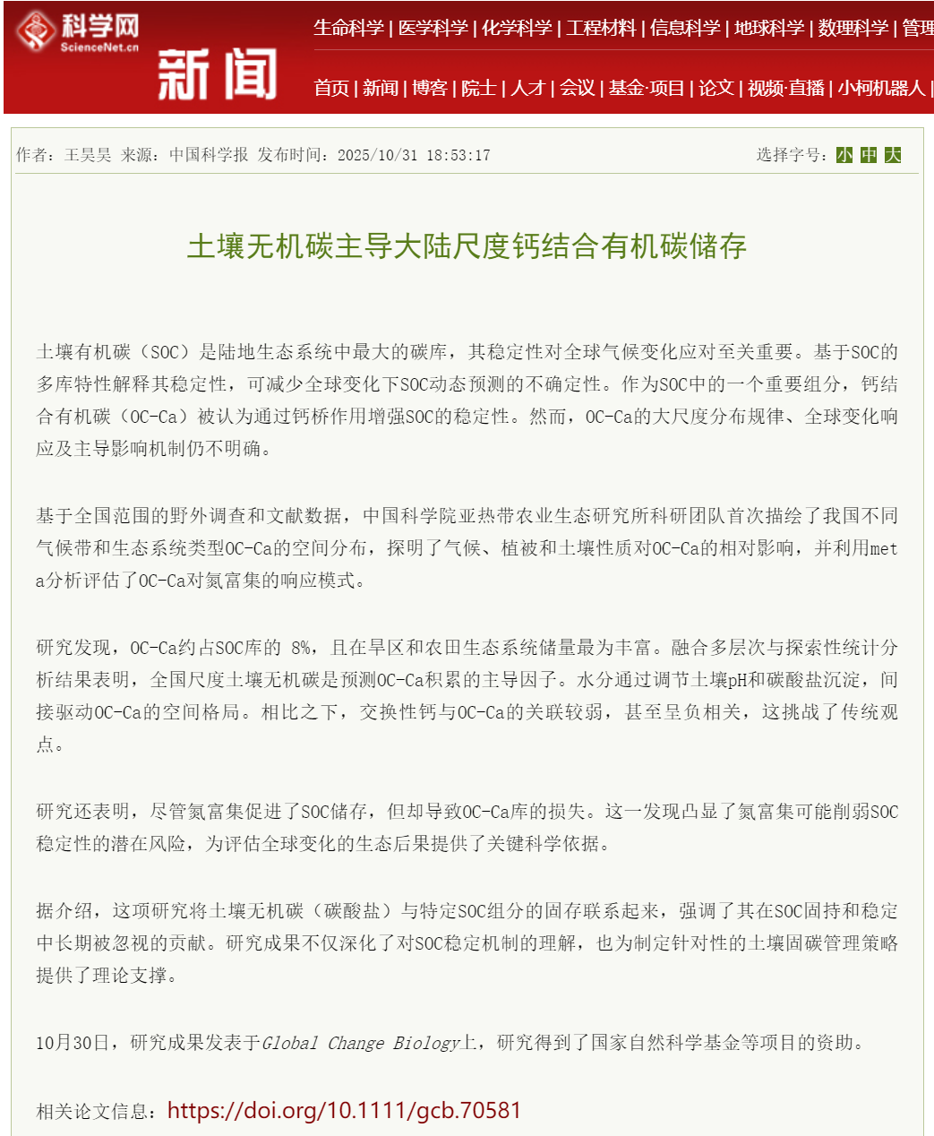 【科学网】土壤无机碳主导大陆尺度钙结合有机碳储存