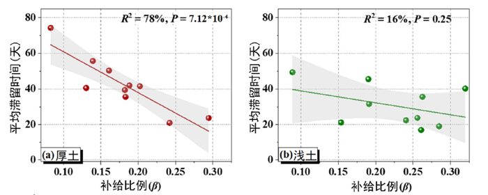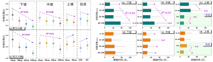 中国科学院亚热带农业生态研究所环江喀斯特生态系统观测研究站陈洪松研究员团队在广西环江通过水稳定同位素示踪技术,揭示了坡地土壤厚度对入渗和径流水补给特征的影响机制。该研究选取两处土壤厚度差异显著的山坡,通过长期原位监测获取土壤水和径流样本,并测定其氢氧稳定同位素组成。基于分段同位素平衡模型,量化了降雨对可移动水的补给比例、平均滞留时间及干旱期径流的蒸发损失比例。结果表明,渗透性更高的浅土山坡具有快速的水分补给特征,表现为更高的雨水补给和水分蒸发损失比例及更短的水分滞留时间(图1)。厚土山坡补给比例和滞留时间具有极显著的相关性(R2=0.78),而浅土山坡这种快速且复杂的水文特征导致其通过水文参数预测过程的难度更高(图2)。因此,即便是在小流域范围,在水资源优化配置方面也需要考虑进行差异性的管理,而土壤厚度理论上是一个重要的参考指标。