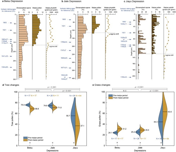 (a-c)18世纪玉米孢粉/植硅体的出现和芒萁孢子的激增保持一致,(d-e)三个洼地树、草孢粉在玉米出现前后变化