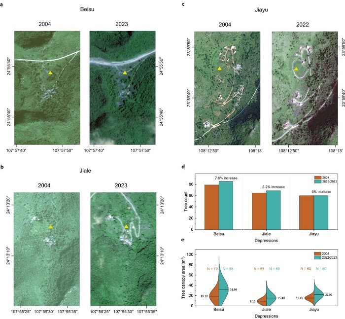 (a-c)三个洼地20年遥感影像前后对比,(d-e)乔木数量和冠幅面积变化