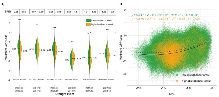 图3 高扰动喀斯特森林在干旱期最大 GPP 损失高于低扰动喀斯特森林