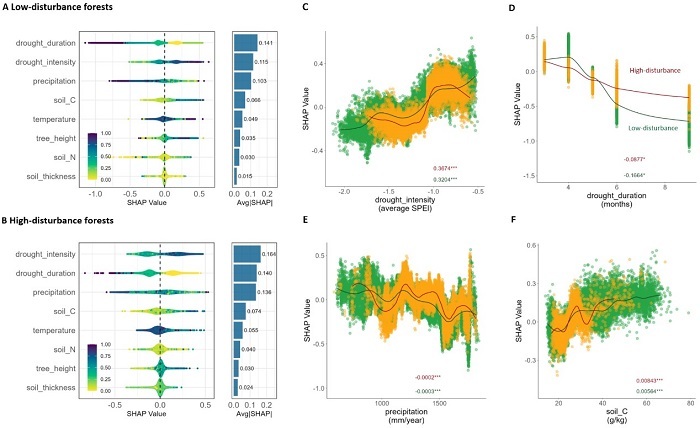结果显示,在相近干旱强度条件下,高扰动森林在干旱期间经历了显著更大的最大 GPP 损失,差异最高可达 13%(图3)。除干旱强度这一主导因子外,气候条件(温度与降水)和土壤因子(土壤有机碳、土层厚度)对高扰动森林干旱期 GPP 损失的调控作用显著强于低扰动森林(图4),表明人为扰动放大了森林生产力对气候与立地条件的敏感性。值得注意的是,尽管高扰动森林在干旱中遭受了更大的生产力损失,其恢复时间并未显著延长,在部分情形下甚至略短于低扰动森林,暗示喀斯特森林中可能存在“干旱抵抗力—恢复力”权衡关系。然而,更大的生产力损失幅度以及更高的气候与土壤敏感性,仍表明高扰动森林整体抗旱能力较弱、对未来极端干旱和持续变干趋势更为脆弱。