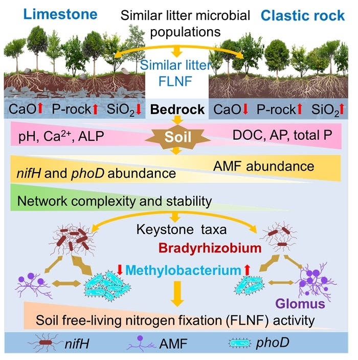 Bedrock-soil geochemistry dominates free-living nitrogen fixation in soils but not in litter via interspecific microbial associations为题发表在